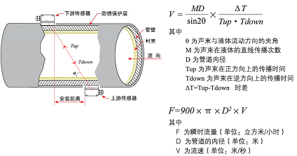 當超聲波束在液體中傳播時,液體的流動將使傳播時間產生微小變化,其傳播時間的變化正比于液體的流速,零流量時,兩個傳感器發射和接收聲波所需的時間完全相同(唯一可實際測量零流量的技術),液體流動時,逆流方向的聲波傳輸時間大于順流方向的聲波傳輸時間。其關系符合下面表達式: